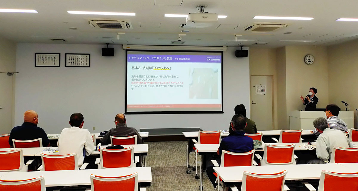 サニクリーングループではおそうじのプロとして、お客様のお悩みを的確に解決するため、長年培ったおそうじのノウハウと知識を制度化した社内資格制度「おそうじマイスター制度」を導入しています。サービス・CSRの一環として企業・団体の皆様に対し「おそうじ教室」を開催しています。