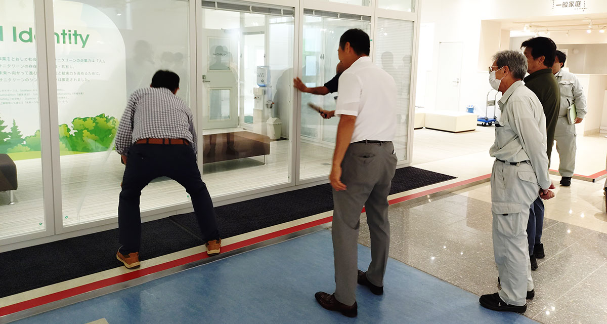 窓そうじの講義や実技を行い、おそうじに関する知識を深めていただきました。さらに、タオルを使ったおそうじ体操でリフレッシュし、マットやモップを洗濯している工場の見学を行い、参加者の皆様に楽しんでいただきました。